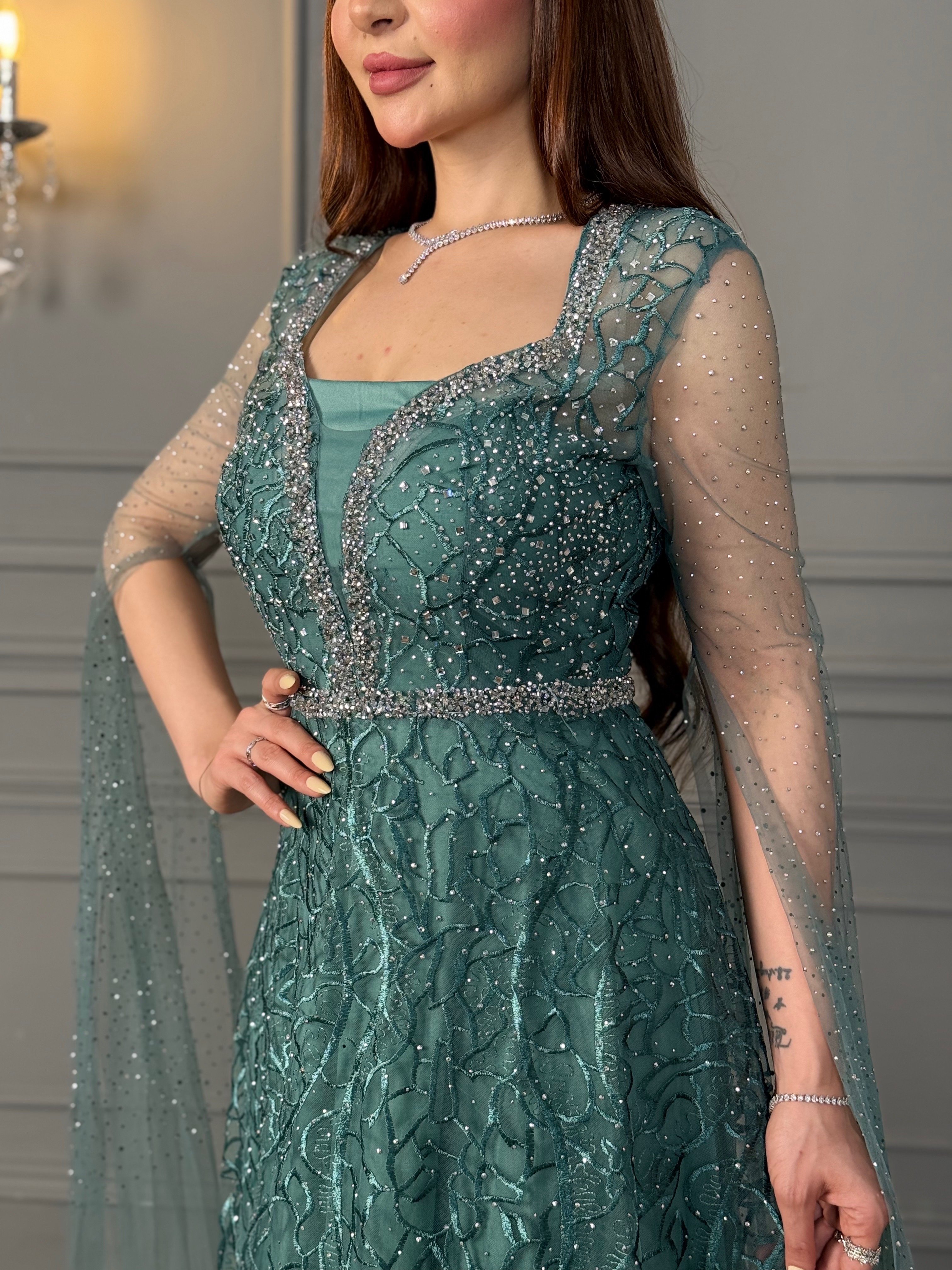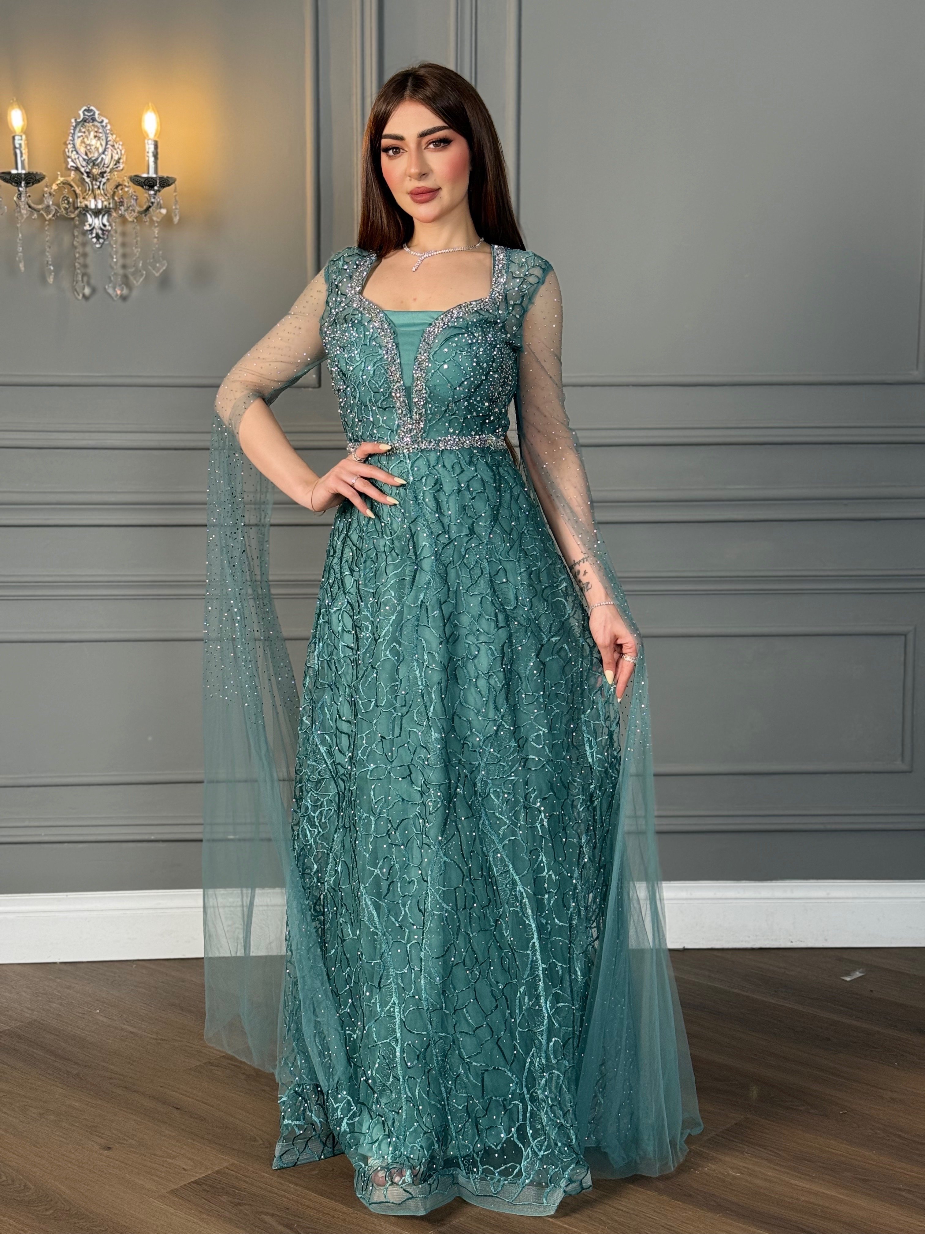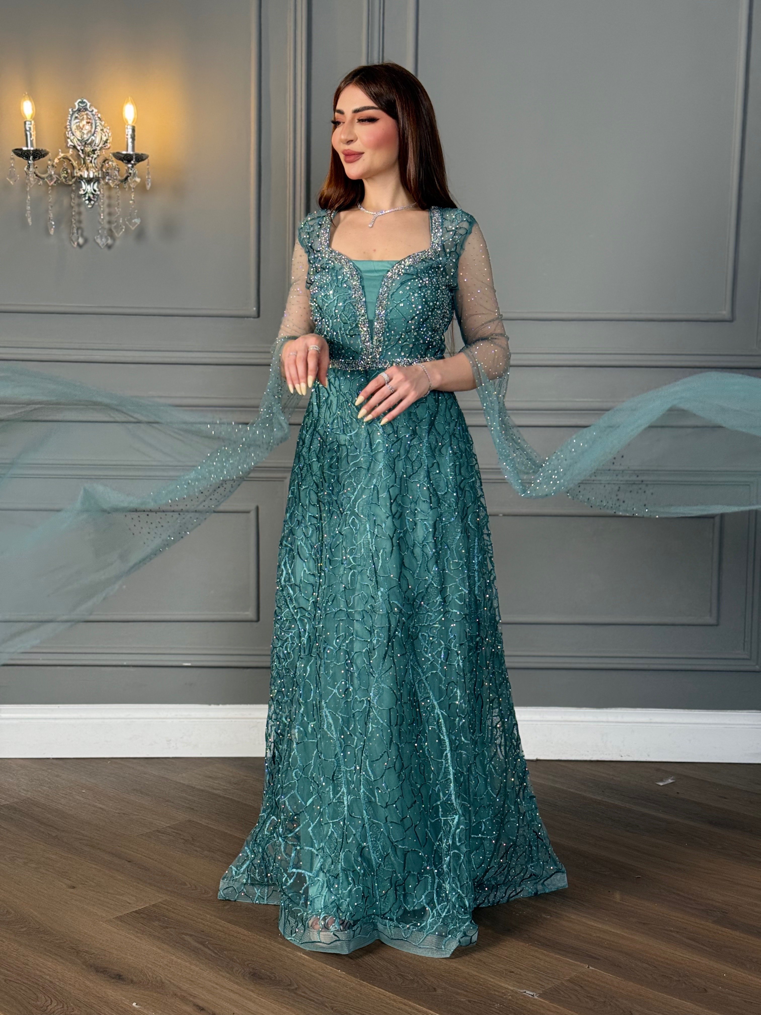 فستان سهرة أنيق بلون زمردي ساحر، يتميز بتطريز فاخر من الخرز اللامع يغطي كامل التصميم بطريقة فنية جذابة. يأتي الفستان بقصة ضيقة من الأعلى مع ياقة مربعة وأكمام طويلة شفافة مزينة بلمعة خفيفة تضيف لمسة من الرقي. تزين الخصر حزام رفيع مرصع يعزز من جمال القوام، وتنحدر التنورة بانسيابية فخمة بطبقات من التول المطرز، مما يمنحه طابعًا ملكيًا راقيًا: