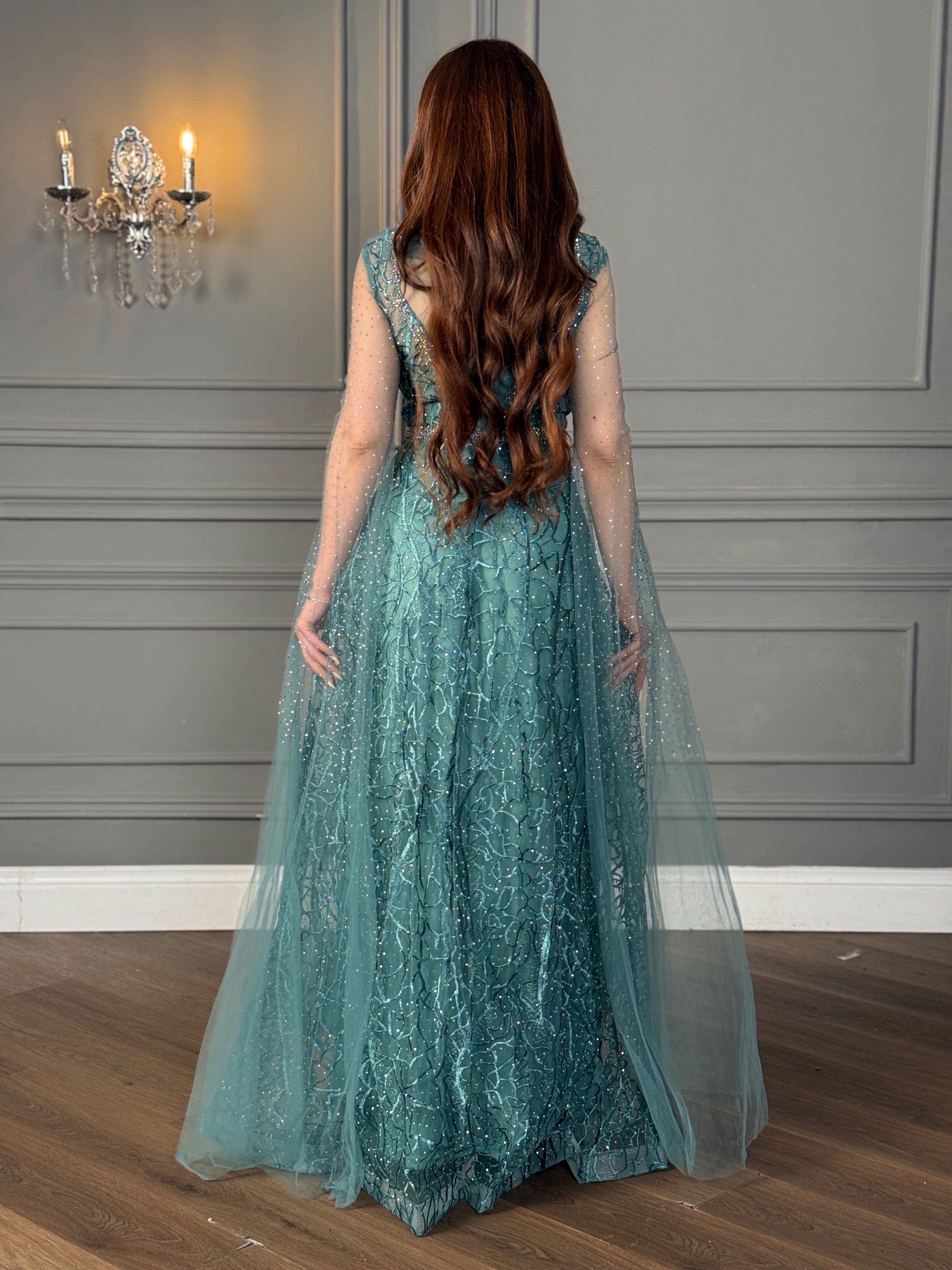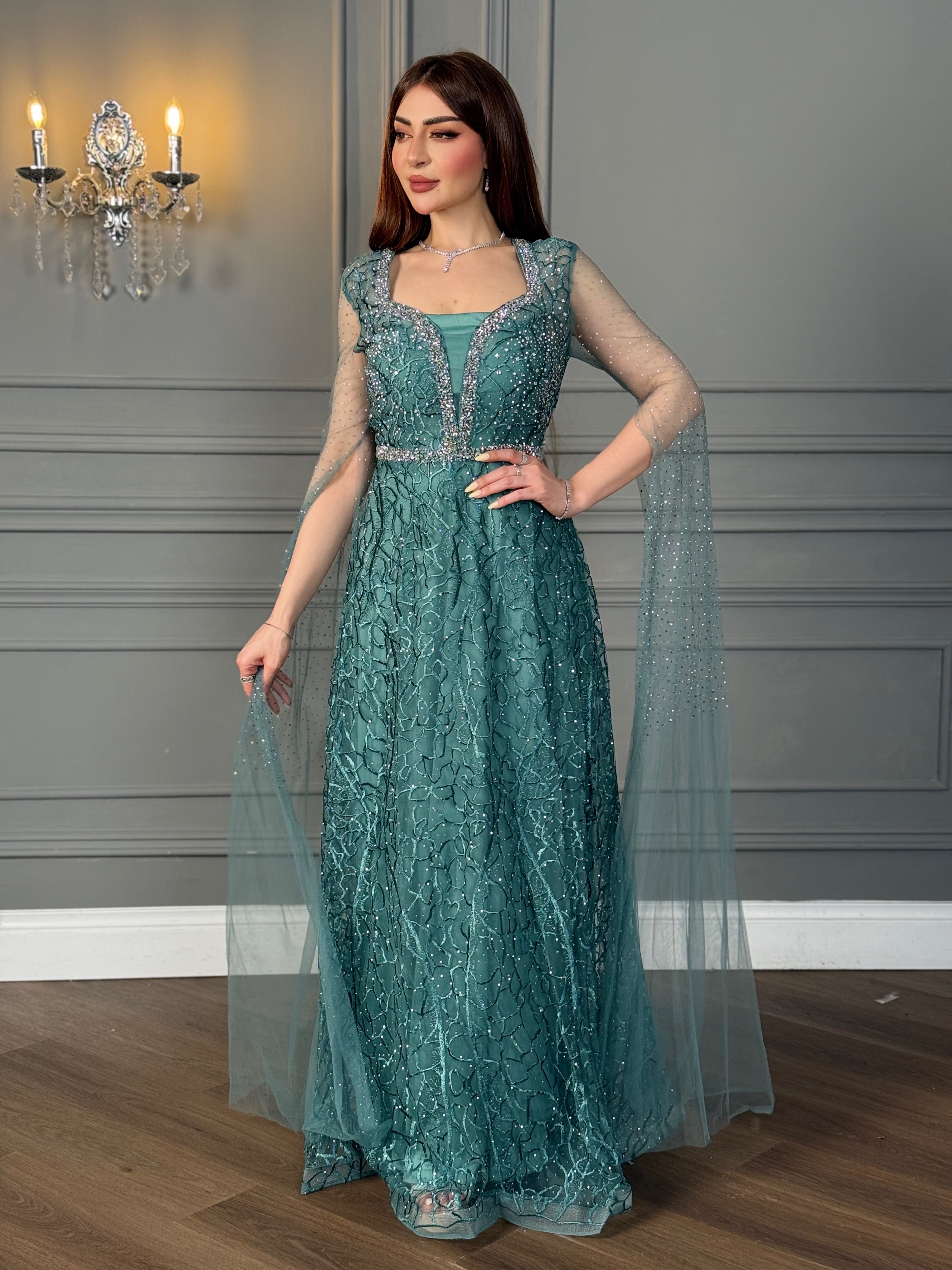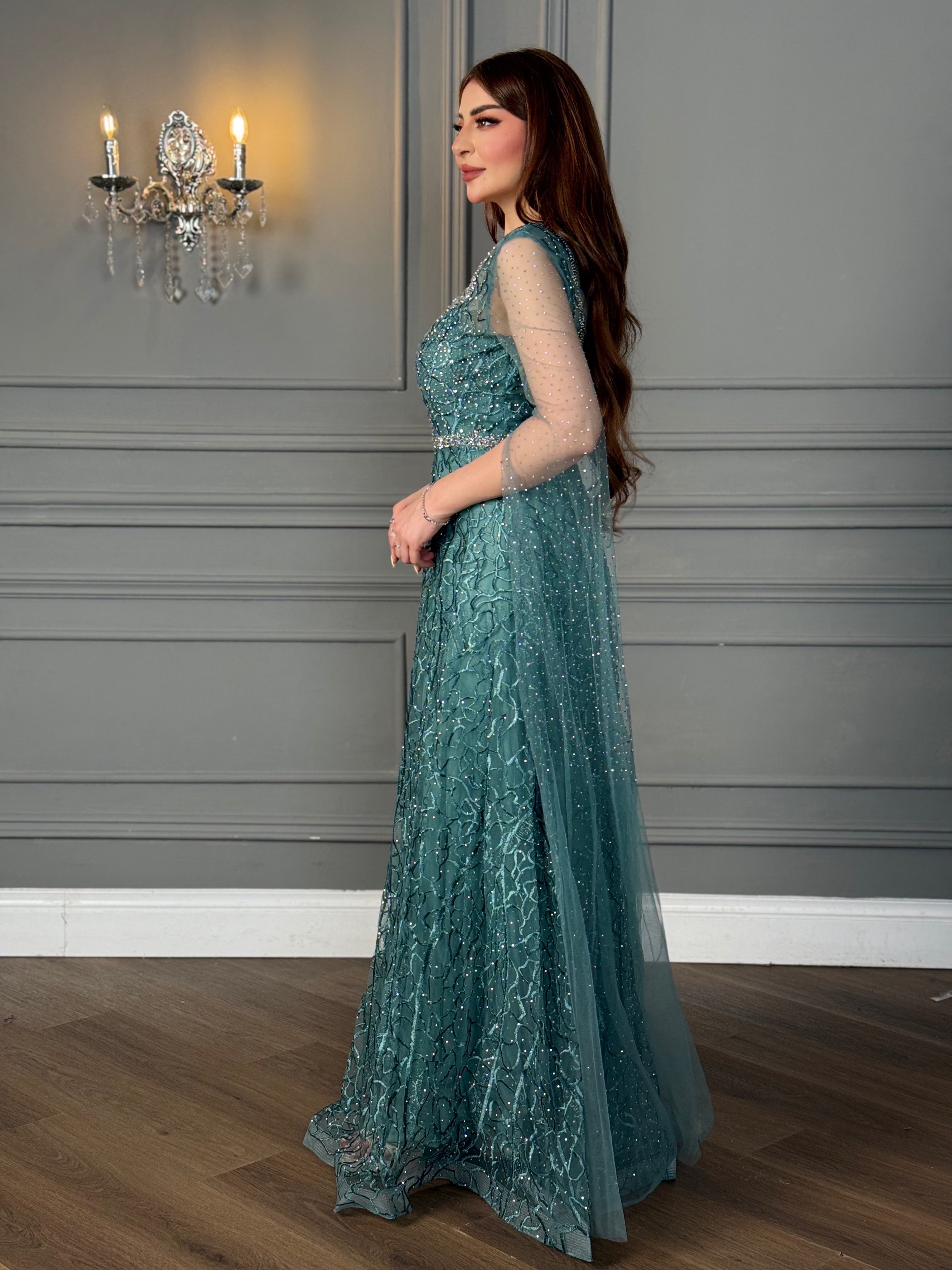 فستان سهرة أنيق بلون زمردي ساحر، يتميز بتطريز فاخر من الخرز اللامع يغطي كامل التصميم بطريقة فنية جذابة. يأتي الفستان بقصة ضيقة من الأعلى مع ياقة مربعة وأكمام طويلة شفافة مزينة بلمعة خفيفة تضيف لمسة من الرقي. تزين الخصر حزام رفيع مرصع يعزز من جمال القوام، وتنحدر التنورة بانسيابية فخمة بطبقات من التول المطرز، مما يمنحه طابعًا ملكيًا راقيًا: