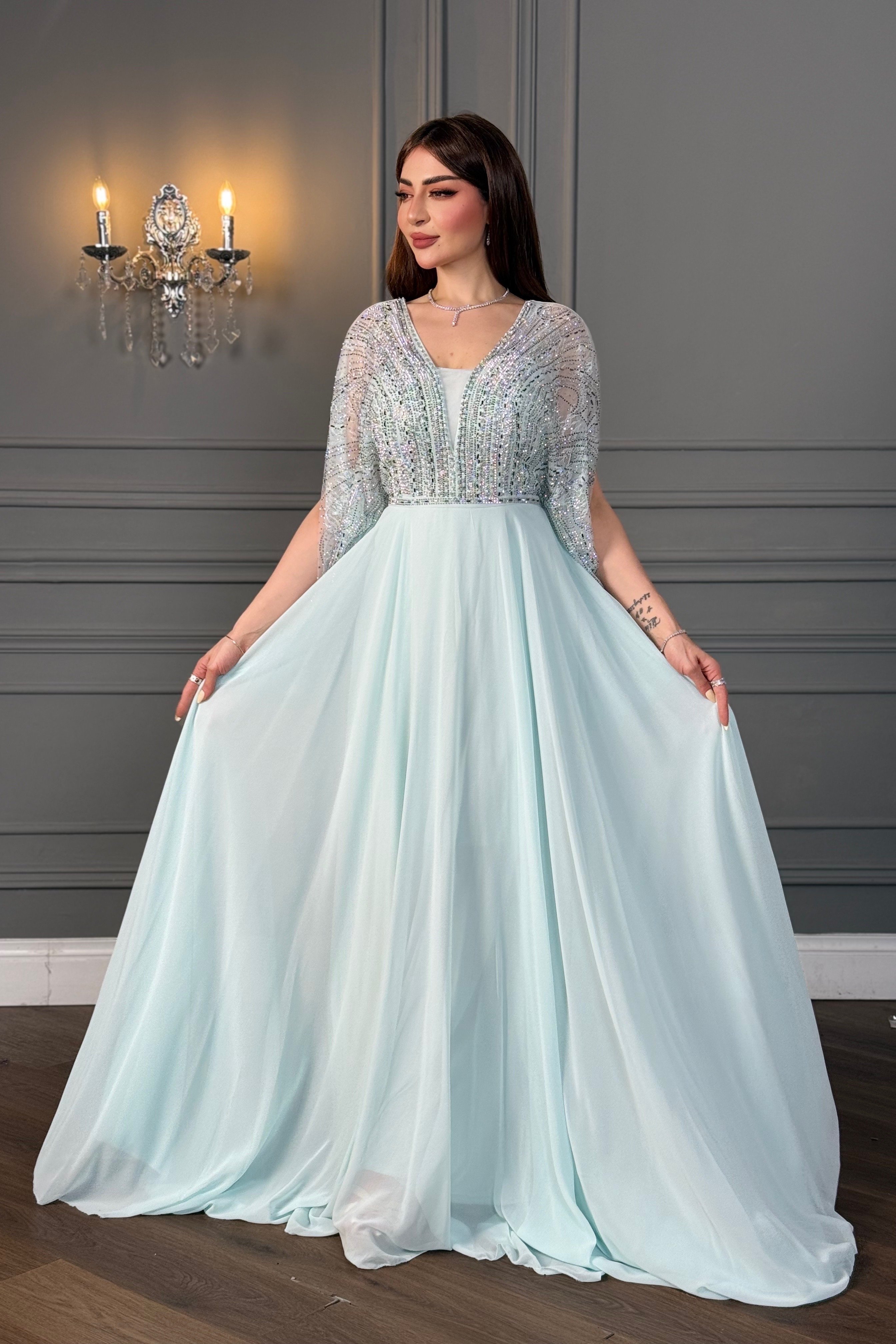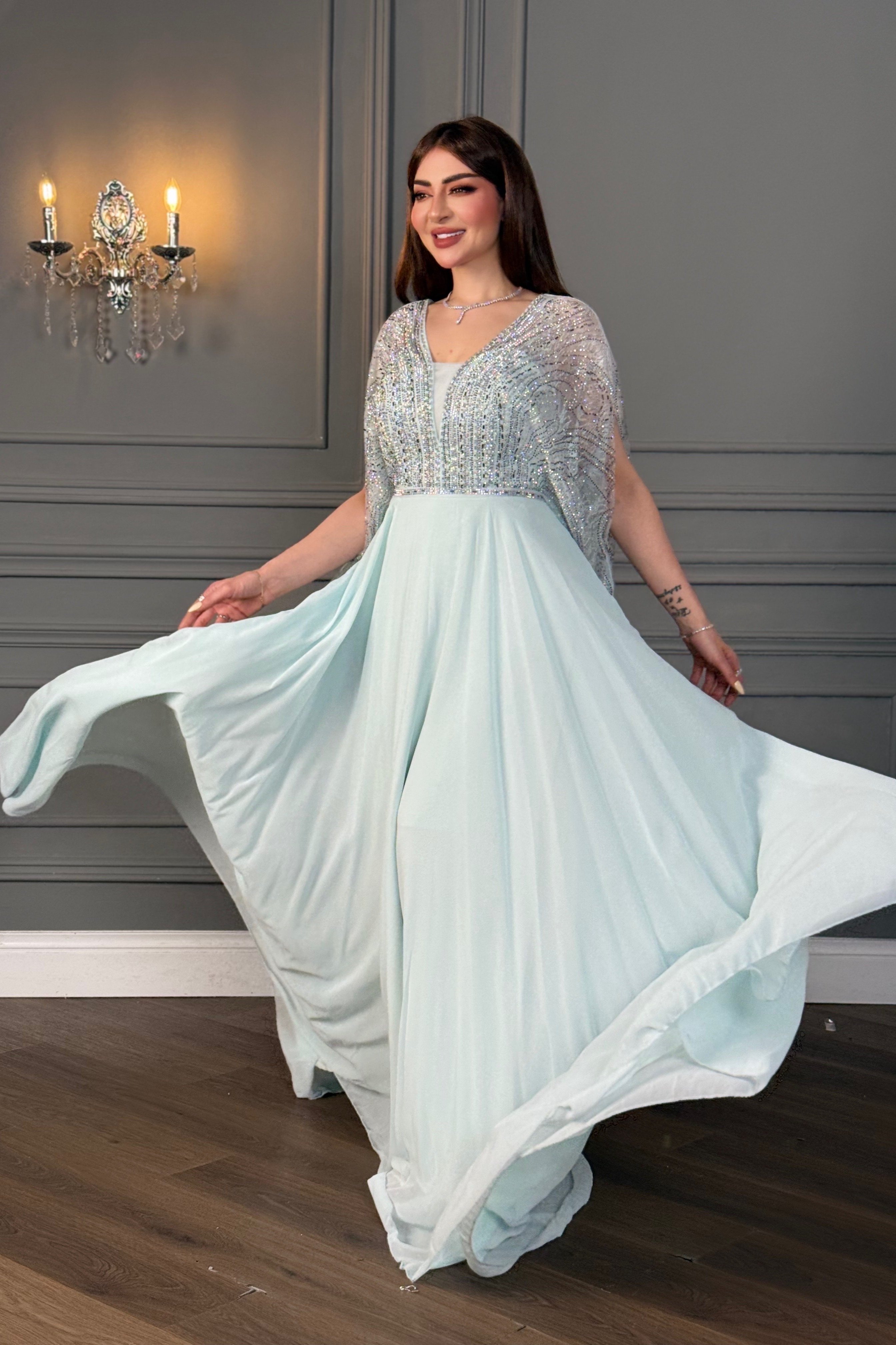 يأتي الفستان بتصميم بقصة ضيقة تبرز أنوثتك، مع تفاصيل لامعة تزيده فخامة. أما اللمسة الأجمل، فهي الأكمام الطويلة الشفافة المصنوعة من الشيفون المطرّز، التي تنساب كالكاب لتضفي مظهرًا ملكيًا آسراً.