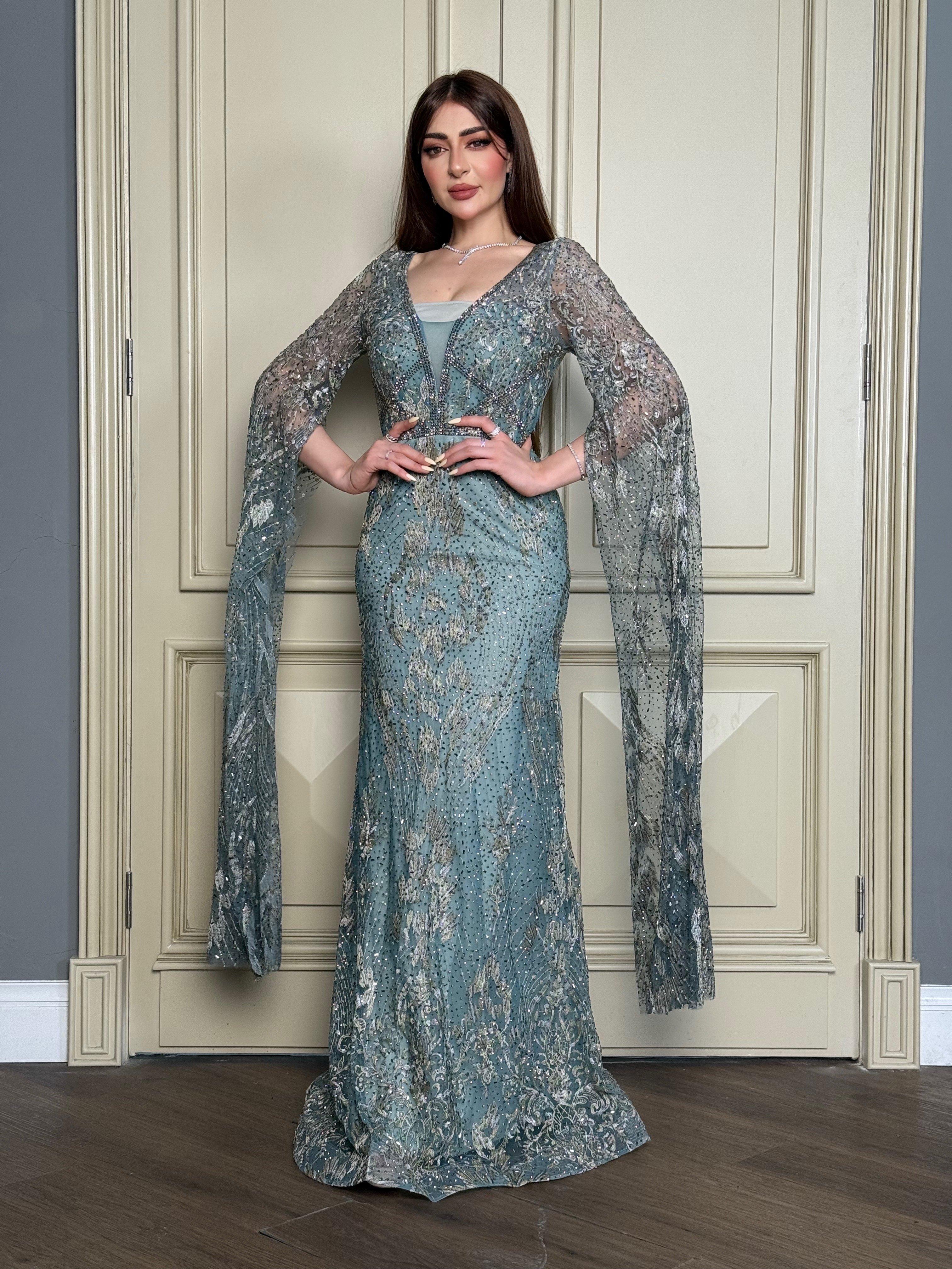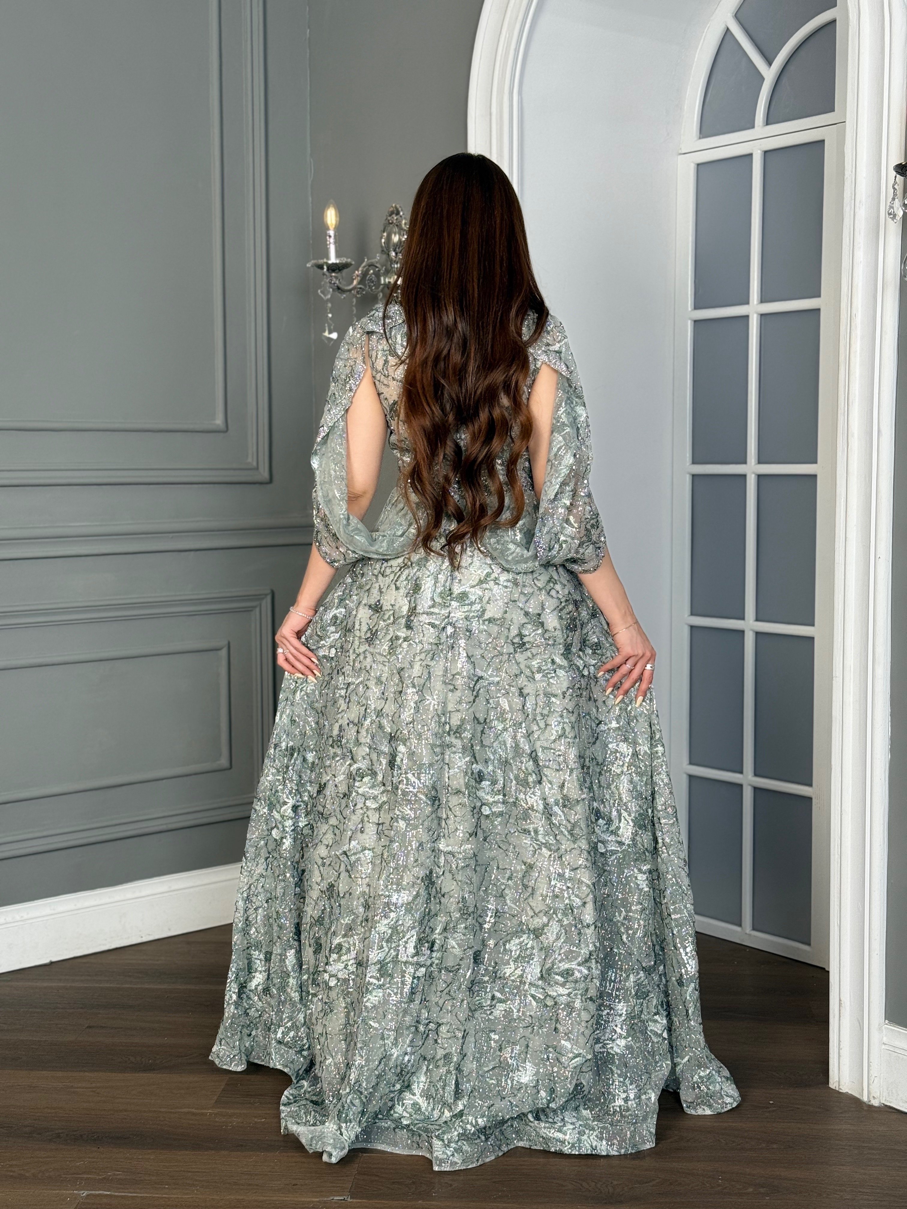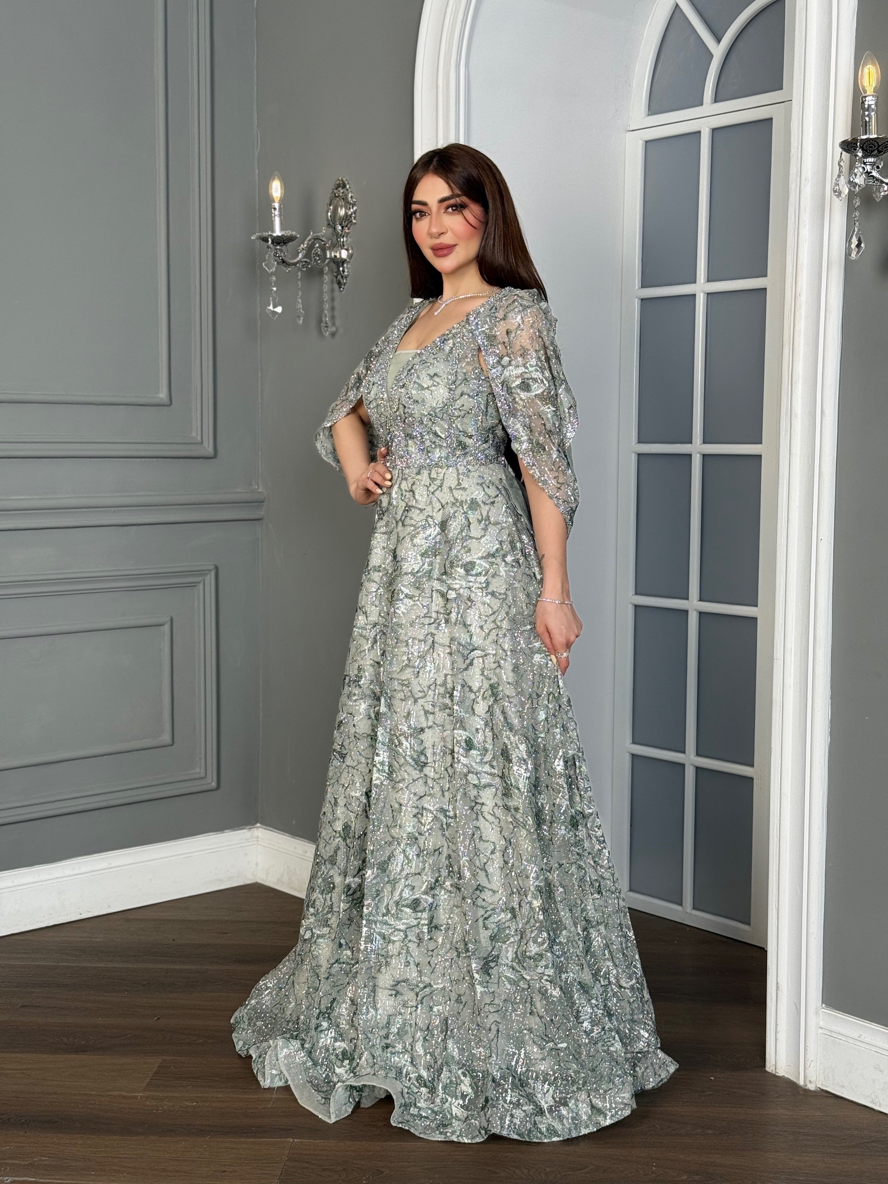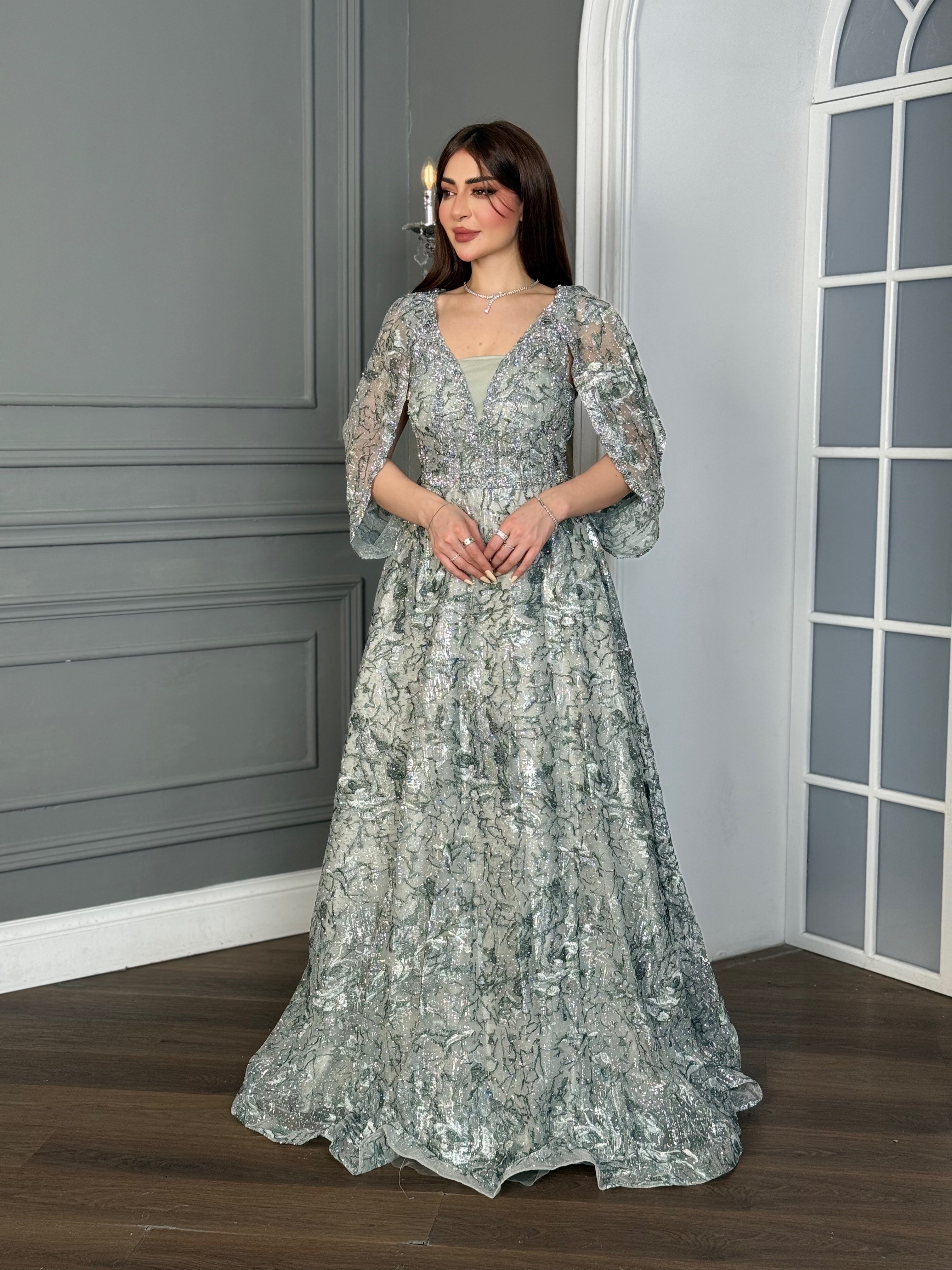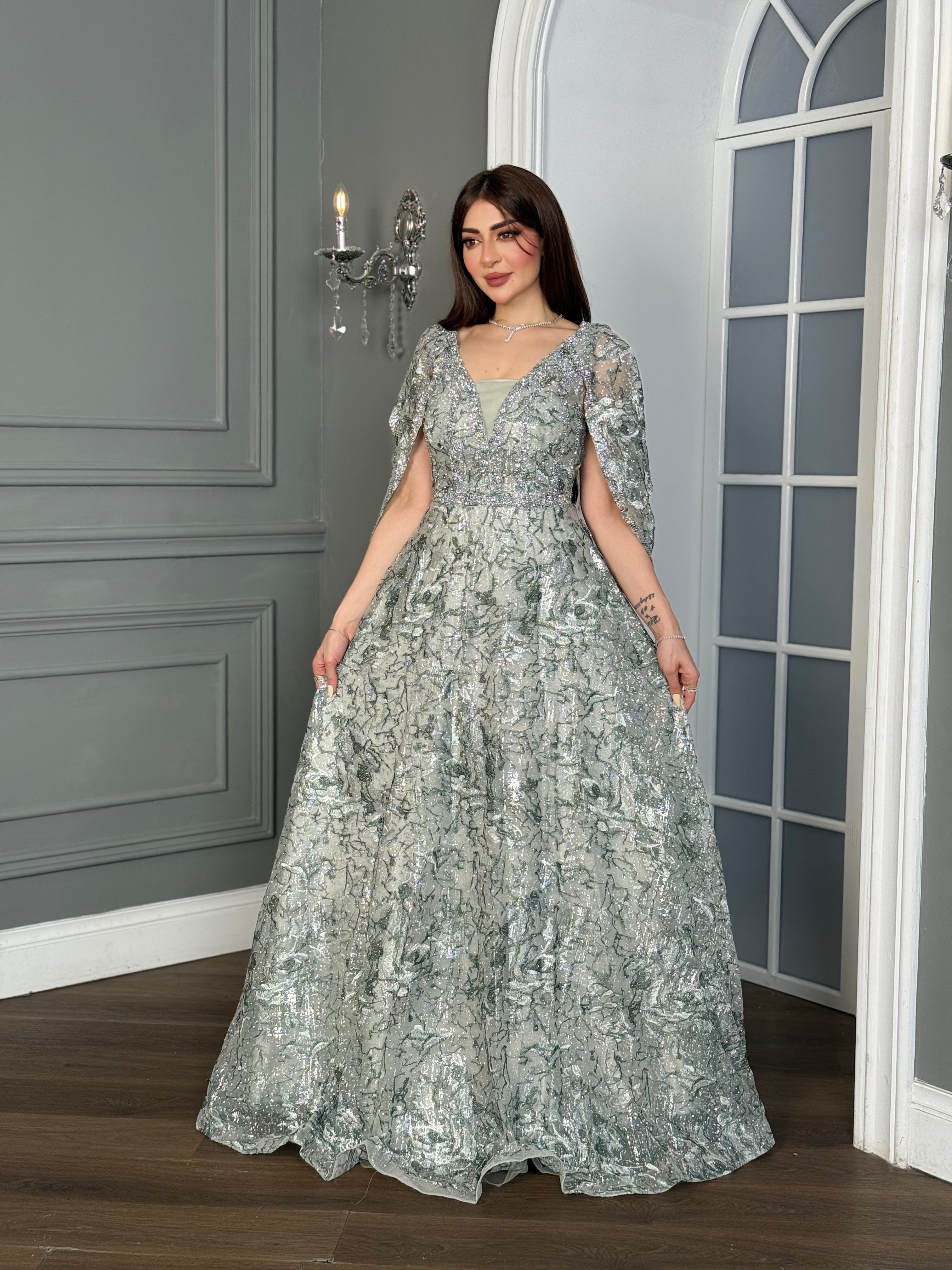 هو فستان سهرة فاخر بتصميم ملكي، يتميز بلونه الفضي المائل للأخضر الهادئ مع تطريزات لامعة تغطي كامل القماش. يتمتع الفستان بقصة منفوشة من الأسفل لإضفاء فخامة وأناقة، بينما الجزء العلوي يتميز بياقة على شكل V وأكمام قصيرة مفتوحة بأسلوب الكاب، مما يضفي لمسة راقية وأنثوية. الخامة المستخدمة تبدو فاخرة ولامعة مع نقشات نباتية تضيف عمقاً وجاذبية للتصميم