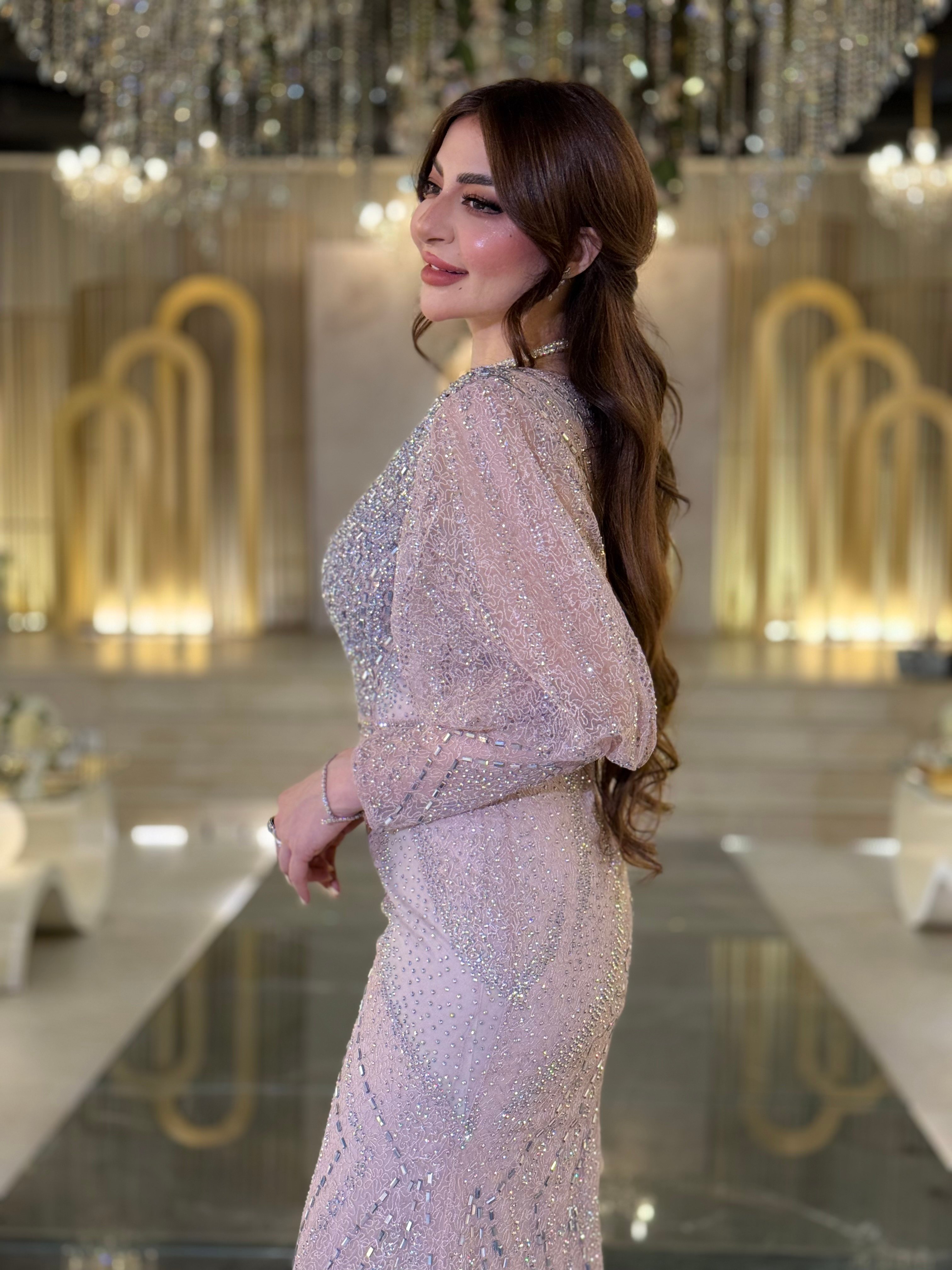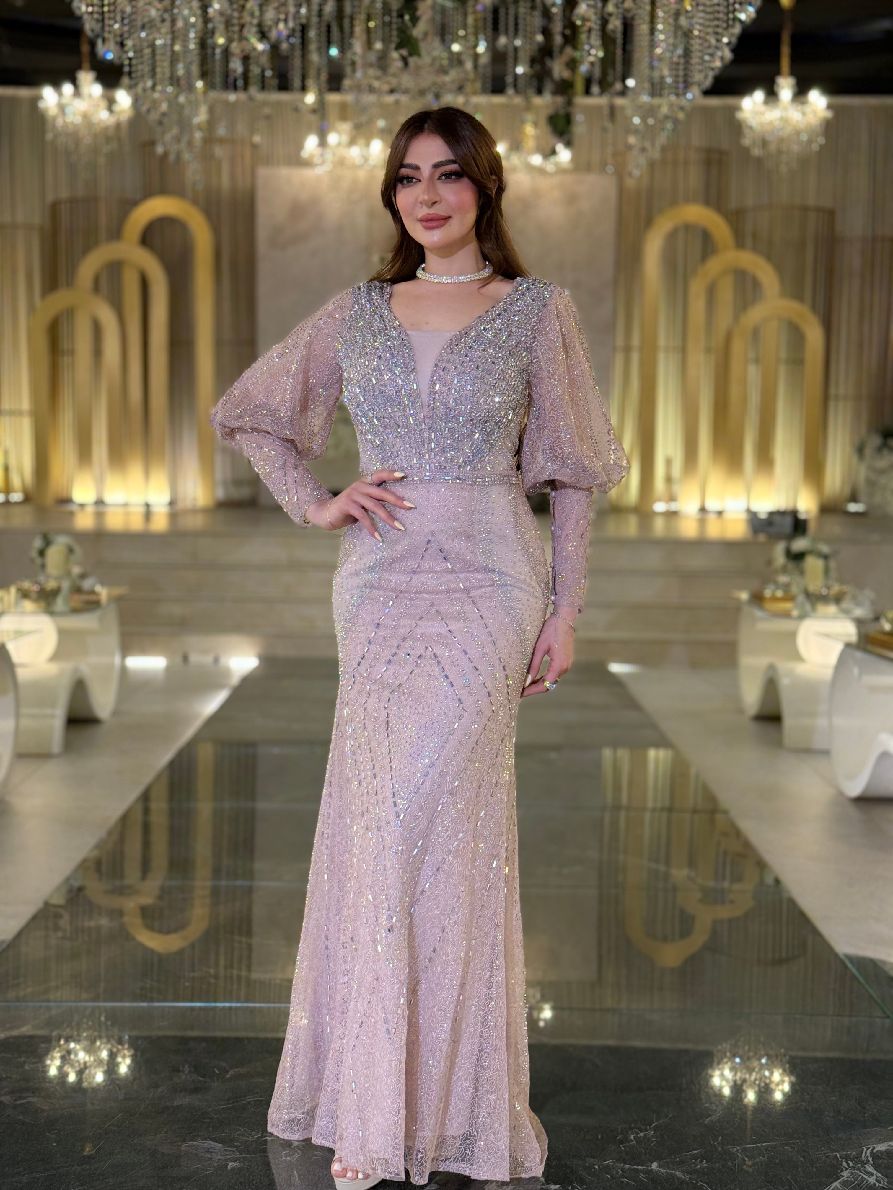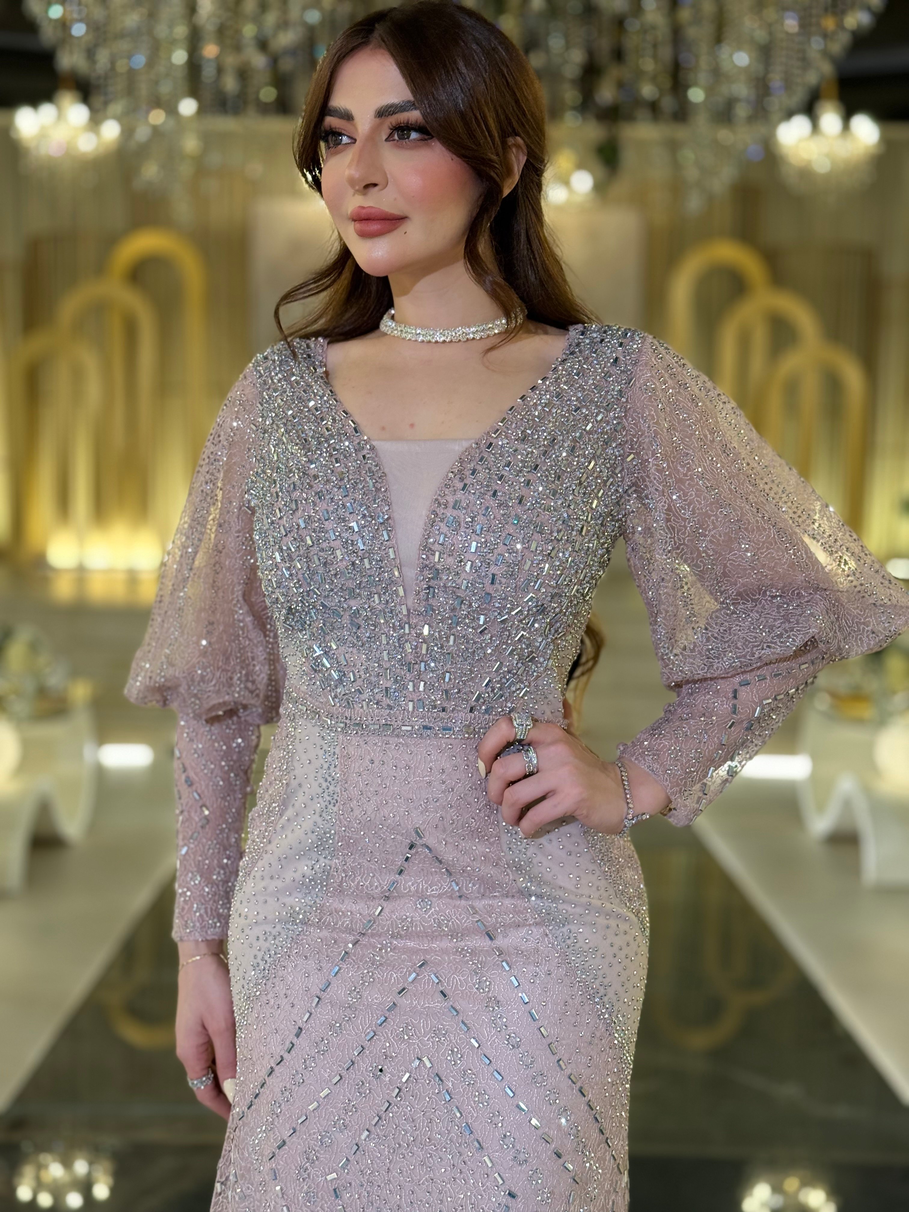 فستان سهرة فاخر بتصميم أنيق من القماش الشبكي المطرّز بترتر فضي يلمع مع كل حركة، يتميّز بقصة ضيقة تُبرز القوام وتنسدل بسلاسة نحو الأسفل. الأكمام منفوخة شفافة تضيف لمسة من الرقي، بينما تمنح الزخارف الهندسية المتناغمة طابعاً عصرياً يلفت الأنظار. مثالي للسهرات الراقية والمناسبات الخاصة