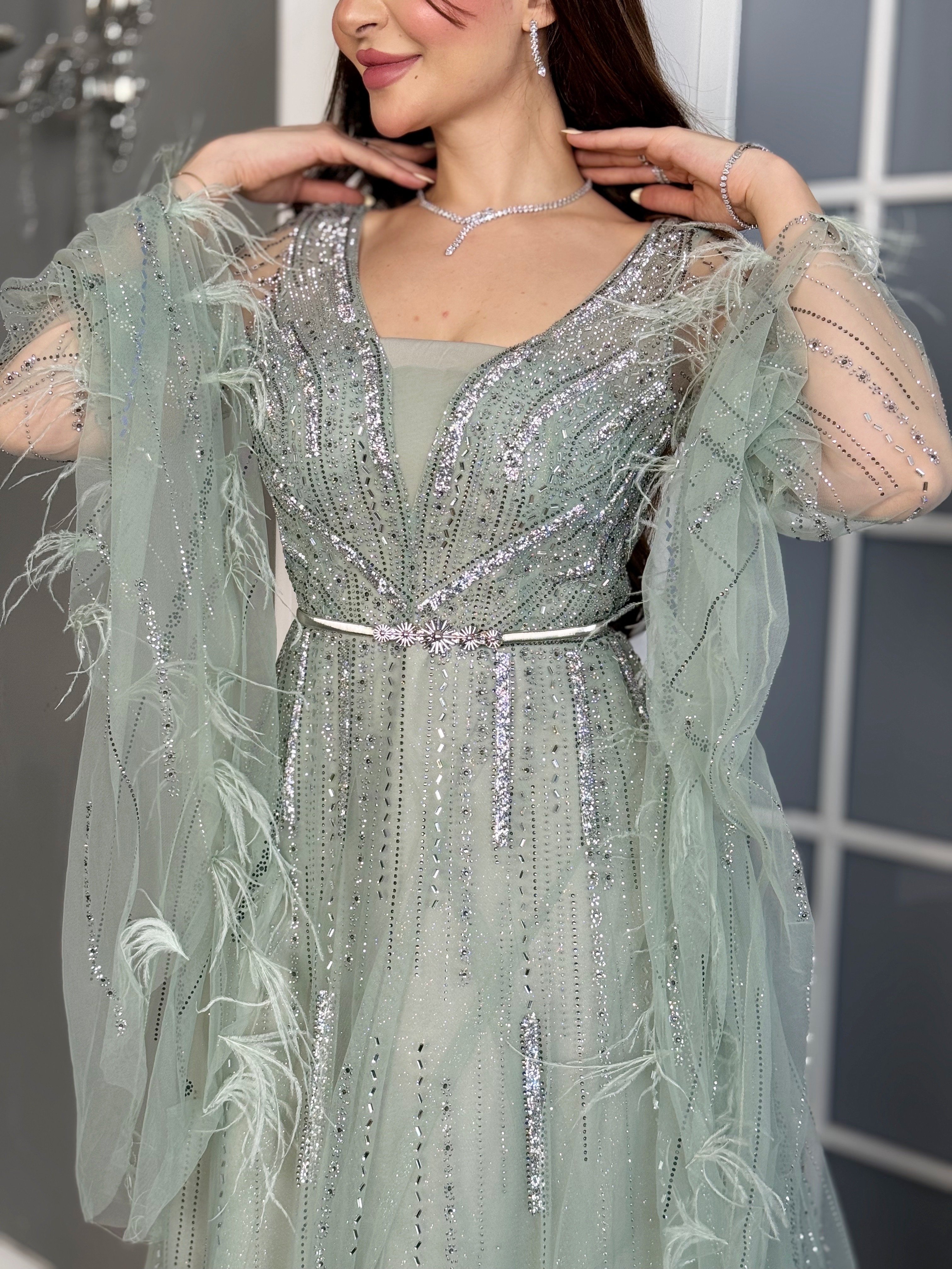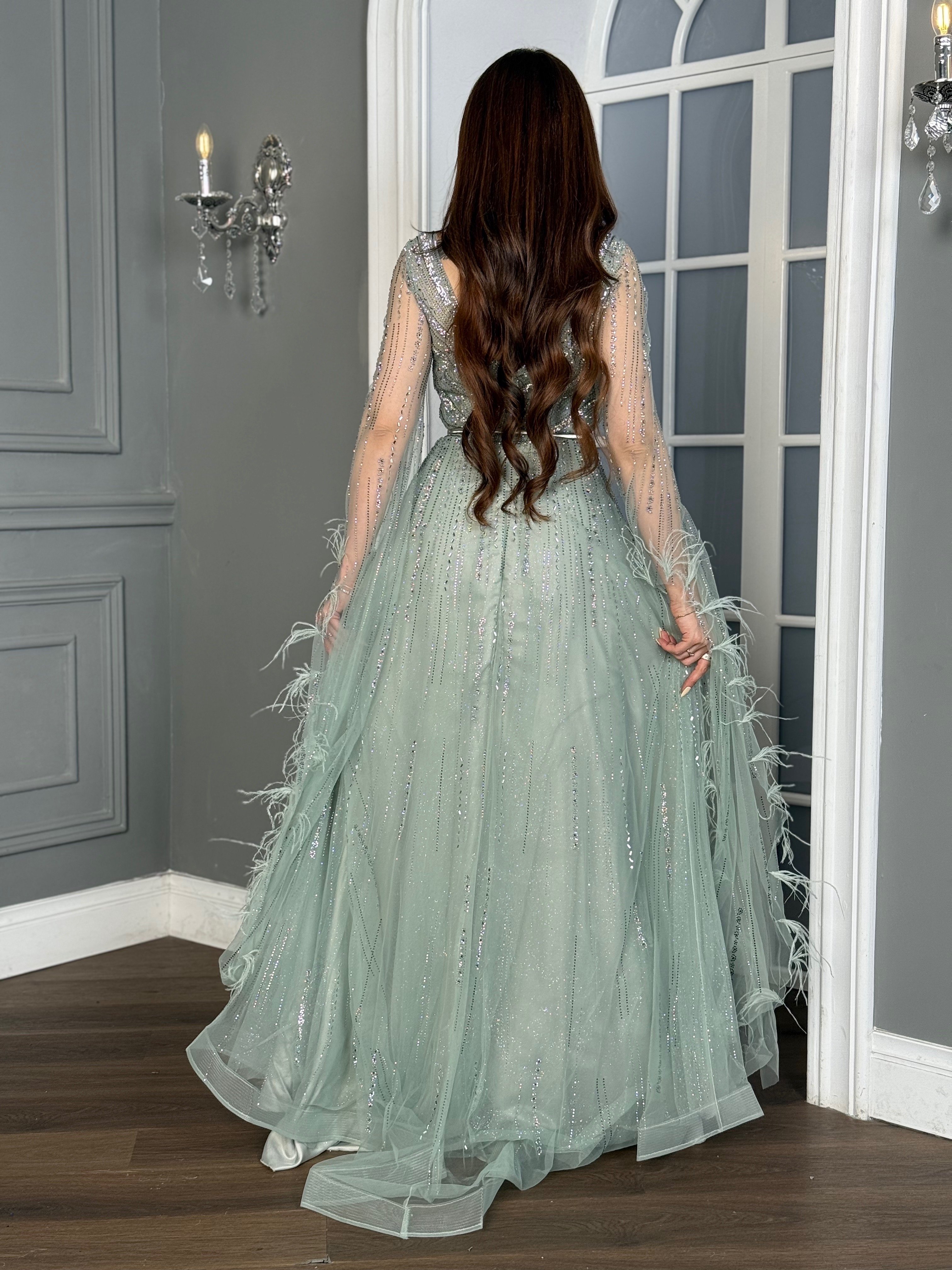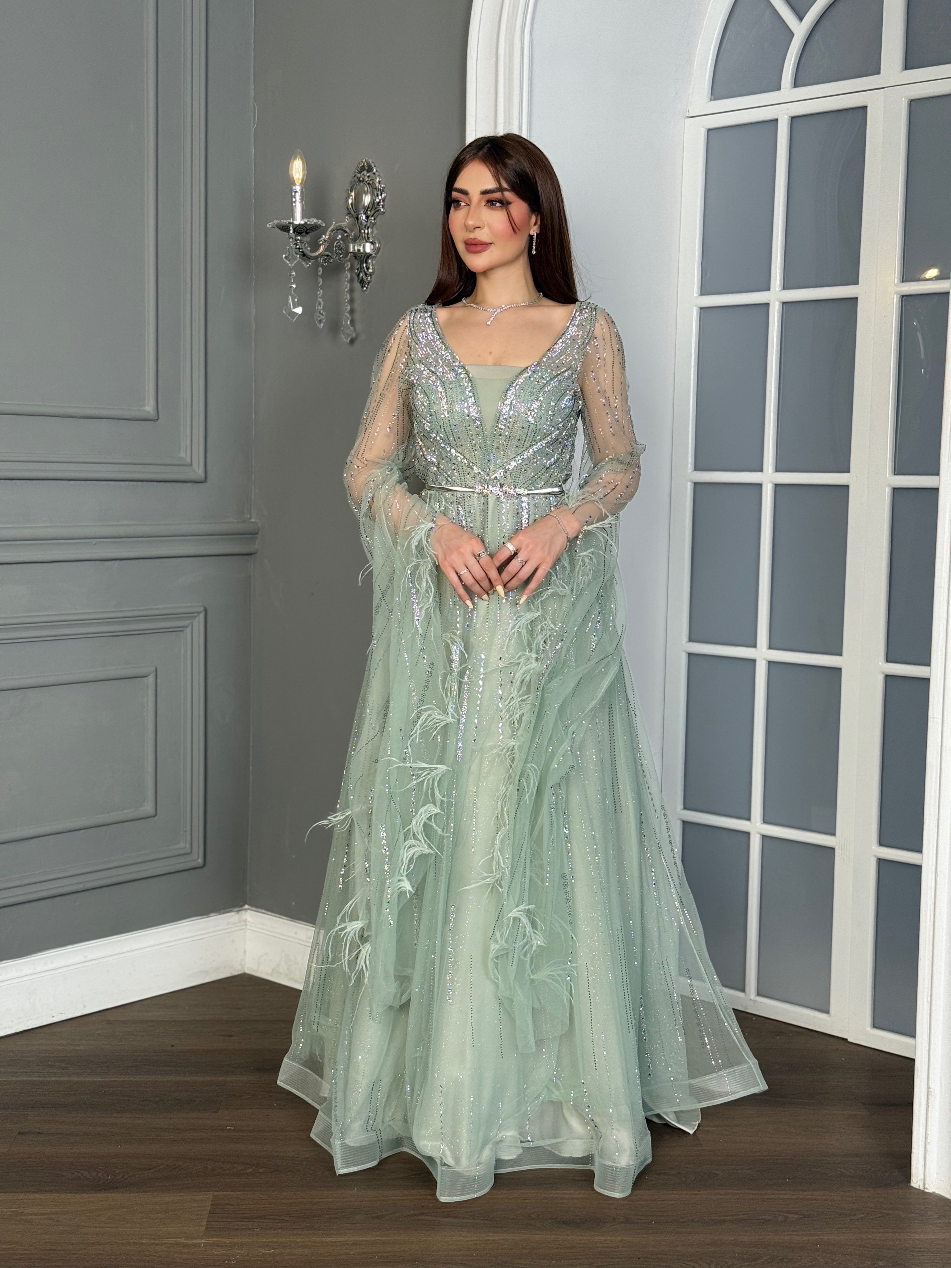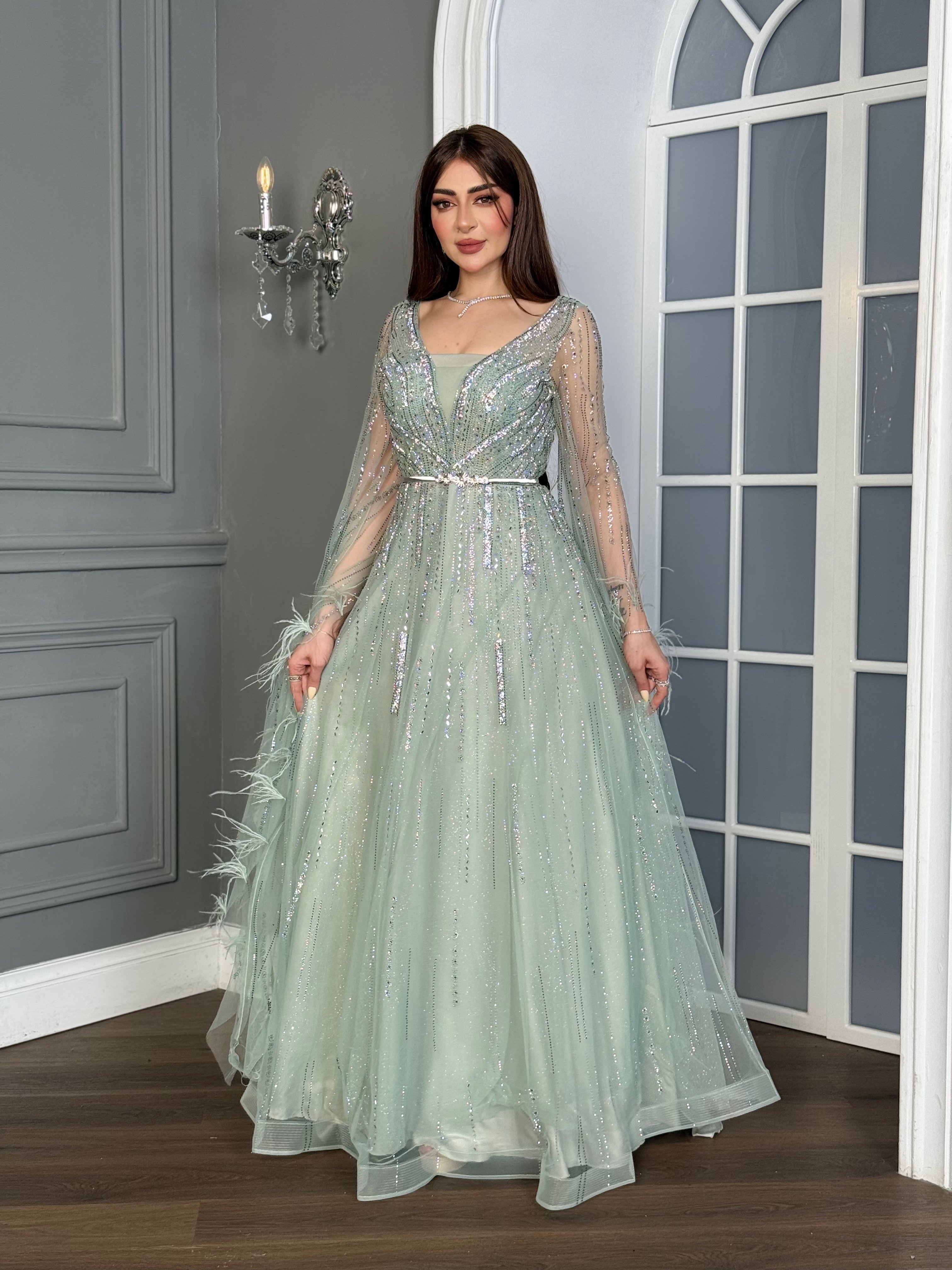 فستان سهرة ساحر بلون النعناع الفاتح، يتميز بتطريز لامع وتفاصيل من الريش الناعم على الأكمام والتنورة، يمنحك إطلالة أنثوية راقية تخطف الأنظار في كل مناسبة