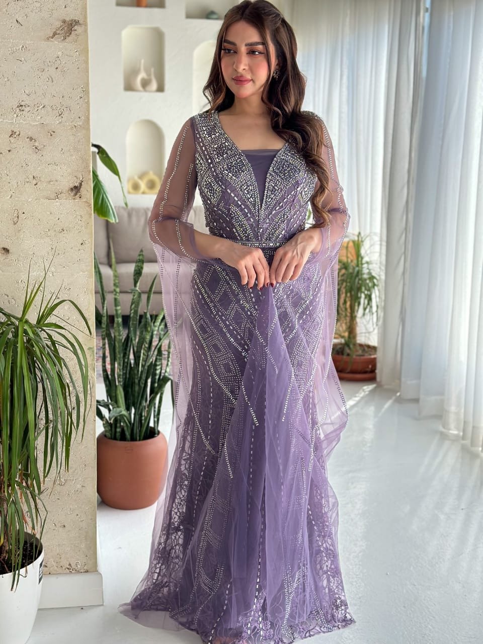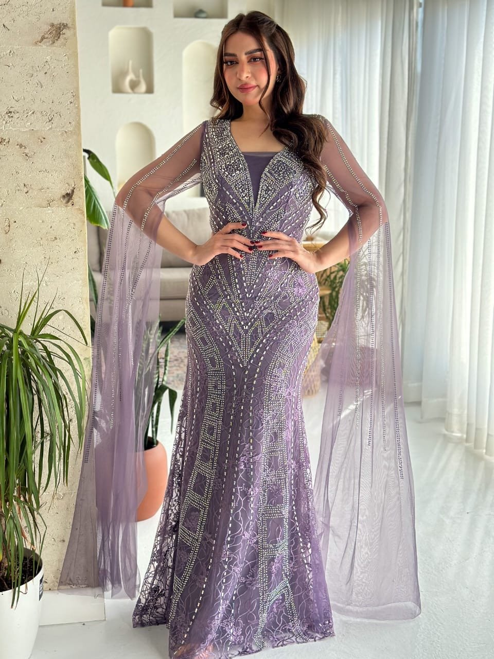 يأتي الفستان بلون بنفسجي ليلكي عميق يفيض بالرومانسية ويُبرز جمال البشرة الخليجية بمختلف تدرّجاتها. تتناثر عليه حبات كريستال دقيقة مُرصّعة يدويًا بتصميم هندسي متناسق يُعيد رسم منحنيات الجسد ويشدّ الأنظار إلى خصرٍ نحيل وقامةٍ ممشوقة. قصّة حورية البحر تنسدل بنعومة على القوام قبل أن تتسع تدريجيًا عند الأطراف الدانتيلية المطرّزة، لتمنحك حركةً انسيابية تشبه خطوات السجادة الحمراء.