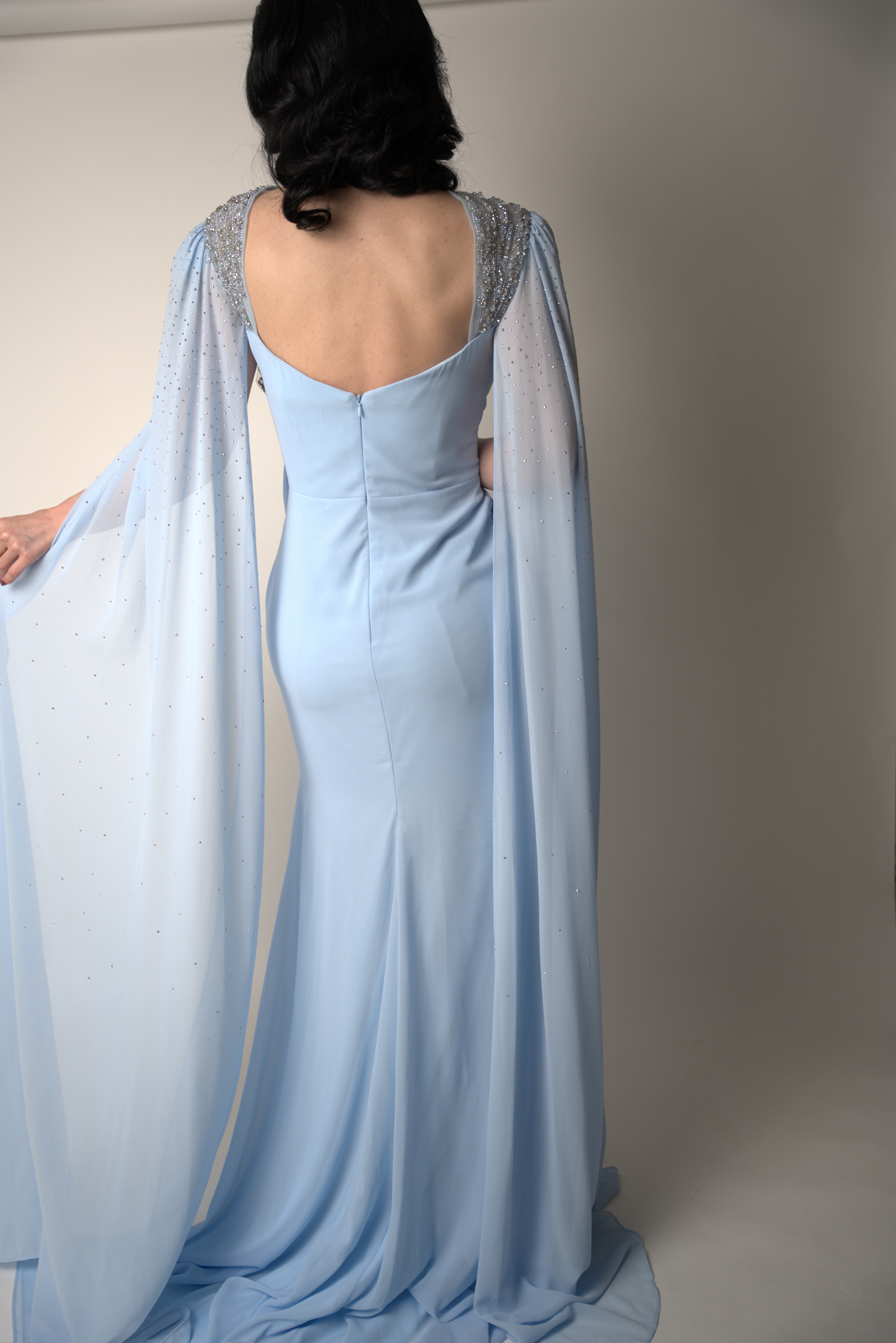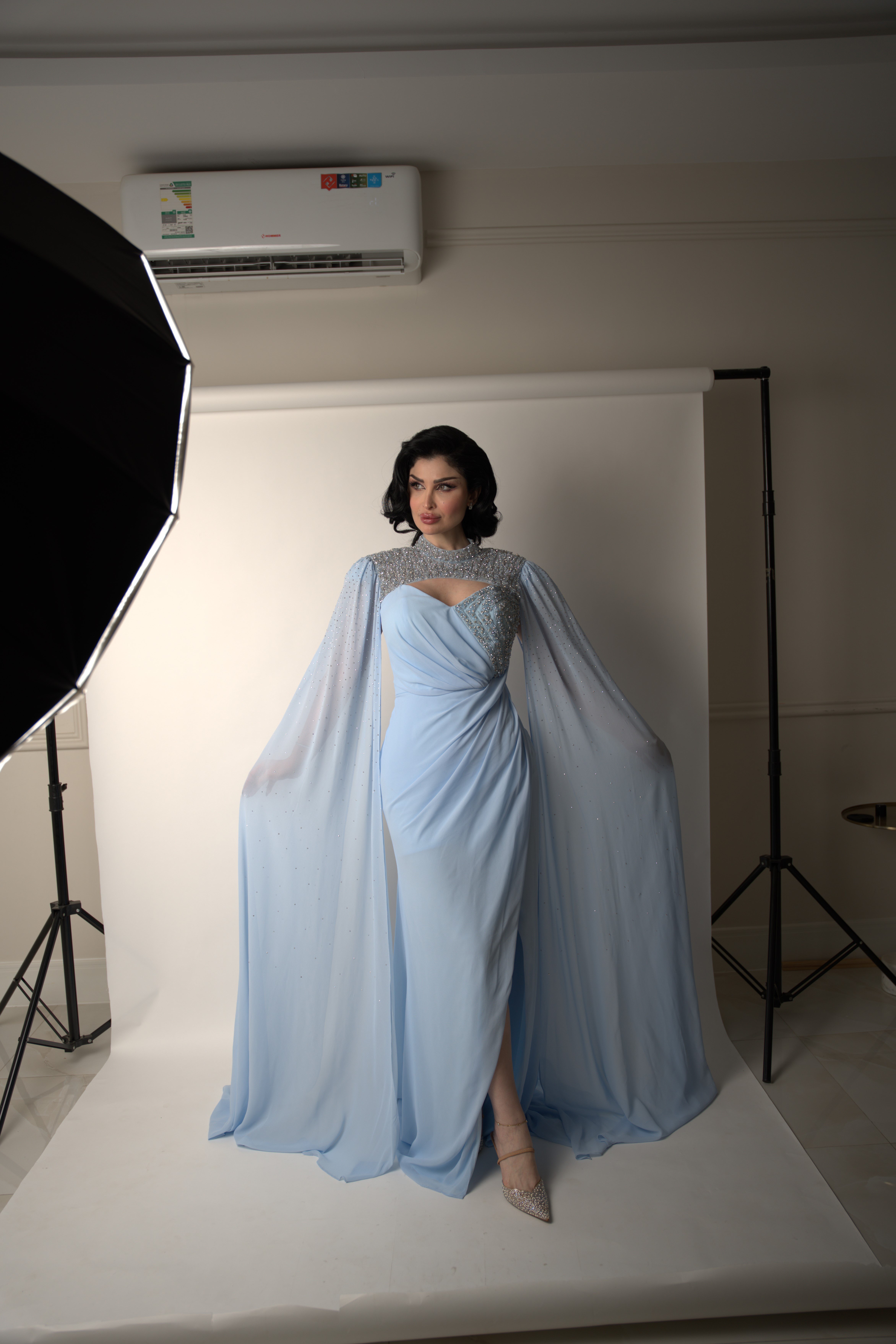 إطلالة ملكيّة تلمع بأنوثتك! فستان سماوي دخاني مطرّز يدويًا بالكريستالات، كاب تول شفاف ينساب برقي، وقصة حورية تعانق القوام وتجمّل الخطوة. خيارك الأنيق لحفلات الخطوبة والزواجات.