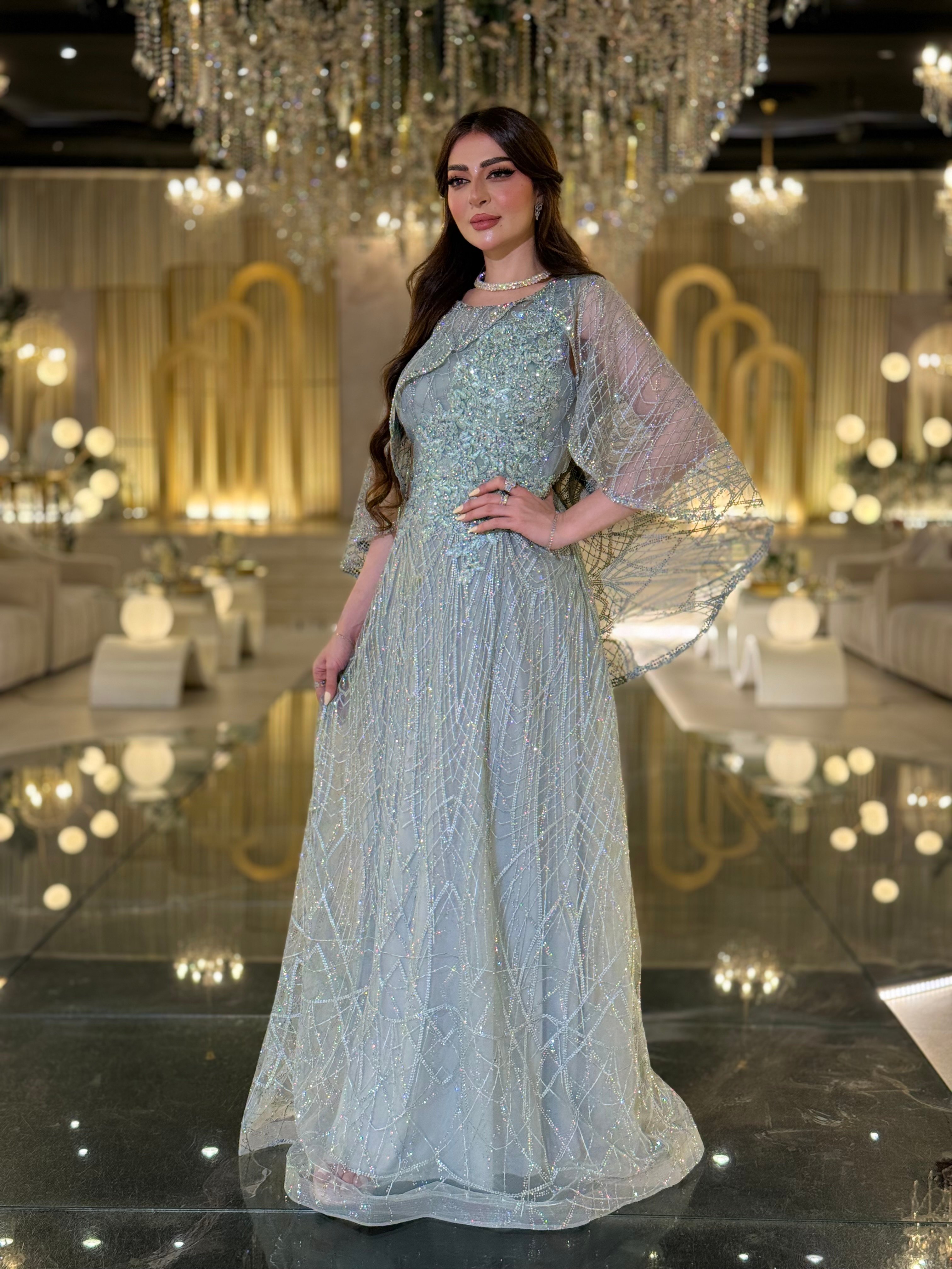 ارتدي سحر الأمسيات مع فستان لحن الكريستال، بتصميم ملكي يأسر القلوب. يأتي بلون أزرق ثلجي مائل للنعناع، تتلألأ عليه تطريزات فاخرة كأنها نُسجت من ضوء النجوم. يتميز بقماش شفاف فاخر على الأكمام يمنح لمسة حالمة، بينما تنساب تفاصيله الهندسية اللامعة بخفة ونعومة على القماش ليمنحك حضورًا يفيض بالرقي والتميّز في كل مناسبة.