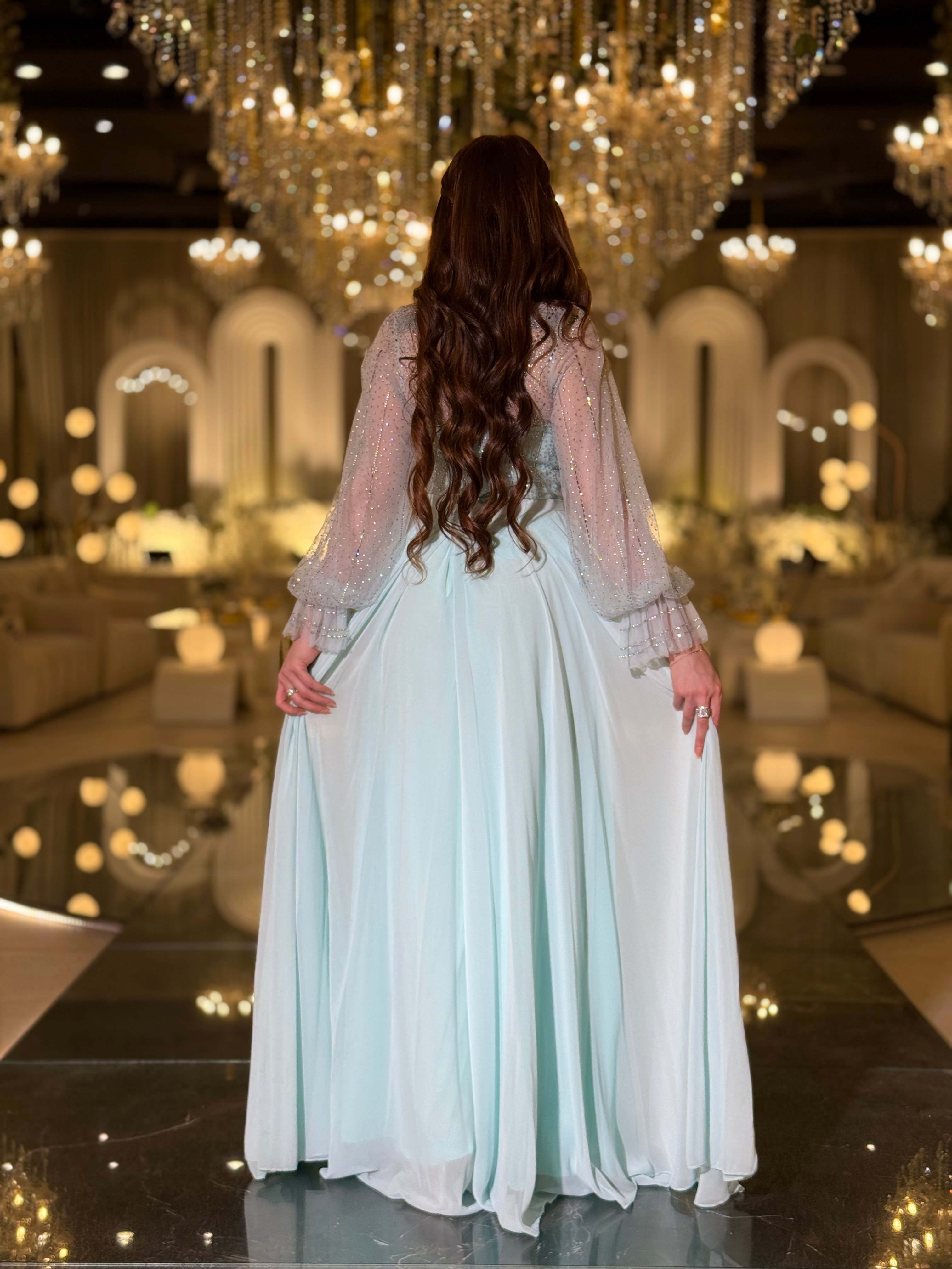 إطلالة ملكية بلون كركمي آسر، يجمع هذا الفستان بين فخامة التطريز اللامع ورقّة التول الشفاف. قصّة A-Line تحدد الخصر وتنساب باناقة لتمنحك قواماً ممشوقاً وإطلالة تخطف الأنظار تحت الأضواء.